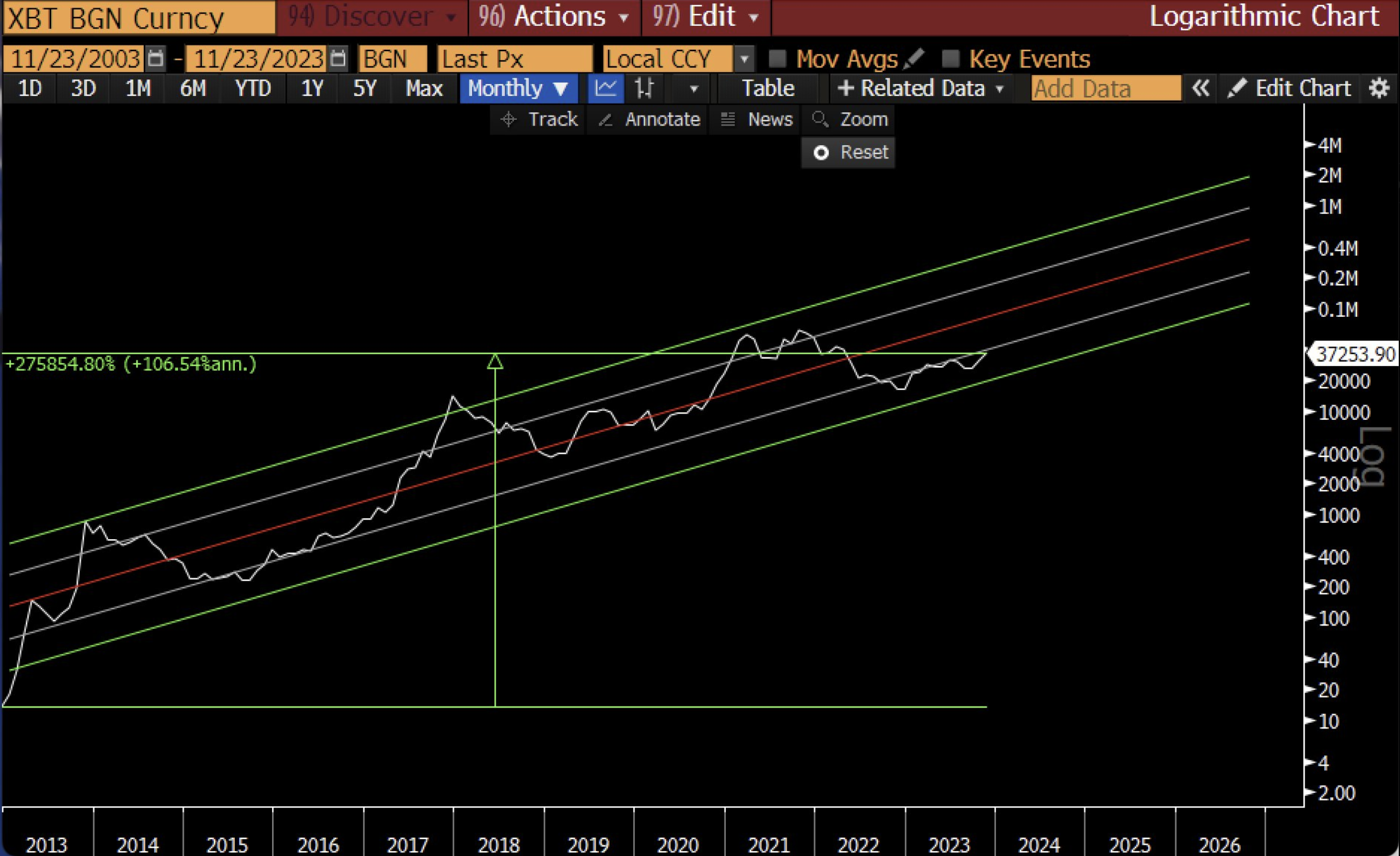 रियल विज़न के सीईओ ने बीटीसी को “अब तक की सबसे अच्छा प्रदर्शन करने वाली संपत्ति” कहा। राउल पाल के अनुसार, आभारी होने वाली दूसरी बात यह है कि बिटकॉइन में लॉग ट्रेंड जारी है। पाल द्वारा साझा किए गए लॉगरिदमिक चार्ट से पता चलता है कि 2026 तक बिटकॉइन प्रति यूनिट 2,000,000 डॉलर तक पहुंच सकता है।